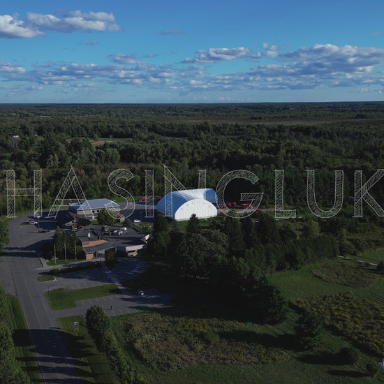 Aerial Toward Lanark County Buildings and Trees Concealing Round Garden