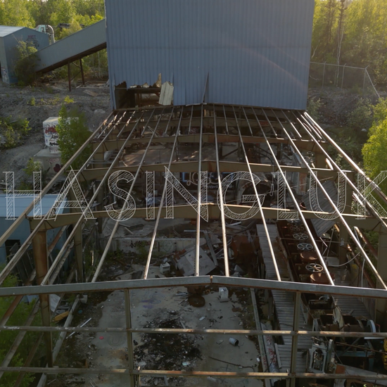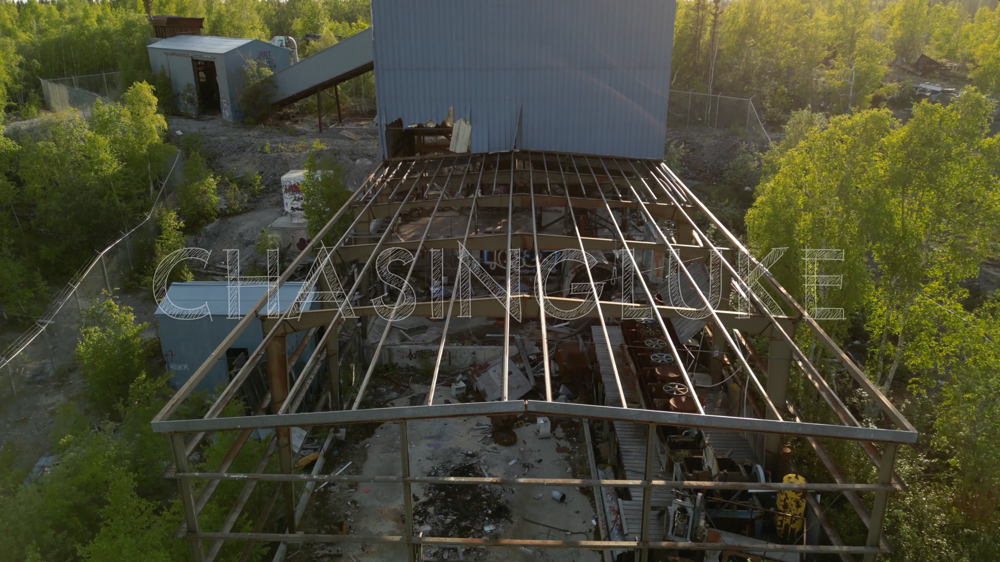 This dynamic drone shot rises above the abandoned Ptarmigan Mine, located along the Ingraham Trail just outside Yellowknife. As the drone ascends, it tilts down to reveal the skeletal frame of a ruined building, with rubble and graffiti visible inside. A perimeter fence encircles the site, seen in the warm glow of late afternoon light.