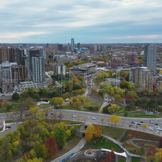 This autumn drone shot captures a smooth descent above Ottawa’s Wellington Street and Portage Bridge intersection. The landscape is painted with lime greens, yellows, and pockets of orange and red as fall colours take hold. As the drone lowers, the Cliff Energy Centre’s parking lot appears next to the Trans Canada Trail. A steady flow of traffic adds an urban rhythm, offering a dynamic view that blends seasonal vibrancy with active infrastructure. Ideal for storytelling around Ottawa’s cityscape, trail systems, or fall transitions.