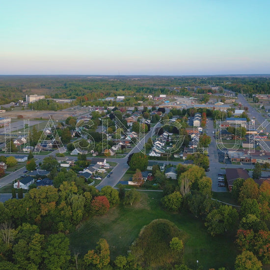 This early evening drone shot picks up where the previous ascent over Hydro Park left off. Flying forward over the residential core of Arnprior, the drone moves toward Bridge Street, with 3rd Avenue running through the center of the frame. The streets form a clear grid pattern, lined with rooftops, trees, and quiet suburban life. Soft autumn lighting warms the neighbourhood, with leaves just starting to show subtle red and orange hues. This smooth forward flyover offers a stable and readable layout of Arnprior’s community, making it ideal for civic visuals, real estate context, or any project showcasing the town’s small-town structure and charm.