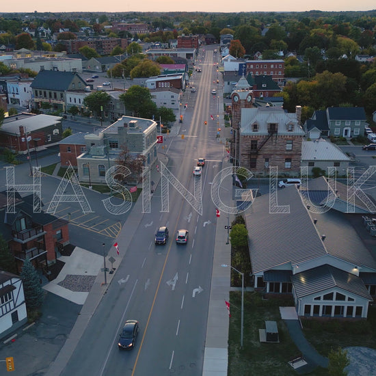 Captured in early evening during the first signs of fall, this subtle drone rotation focuses on the Arnprior District Museum, home to the town’s iconic clocktower. The historic structure's presence anchors the scene as the camera starts to partial orbit slowly. Below, light traffic moves through quiet streets, while most of the surrounding trees remain green with hints of orange and red emerging in pockets. This clip is perfect for civic storytelling, heritage content, or promotional footage capturing the character of Arnprior.