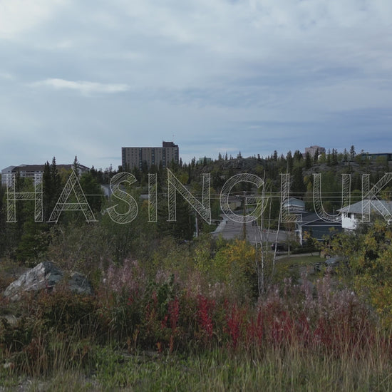 A drone rises over Yellowknife’s fireweed and autumn trees, revealing 48th Street, School Draw Avenue, and the city’s downtown core in early fall.