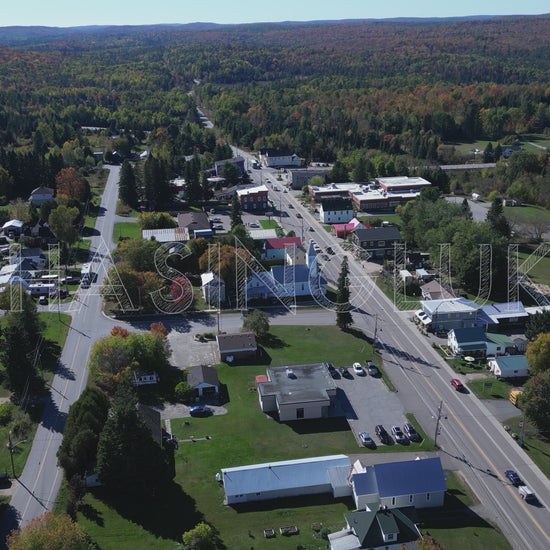 This smooth forward drone flight moves west through the centre of Maynooth, Ontario, beginning with Young Street on the left and the edge of the public school clipped on the right. The drone glides over the town’s church and continues alongside Highway 62 toward the public library and general store. The clip concludes with the intersection at Highway 127 in the foreground. Midground trees show early signs of autumn colour while burnt orange tones wash over the distant hills, all beneath a clear afternoon sky. Ideal for rural transitions, seasonal establishing shots, or visual storytelling rooted in small-town Ontario.