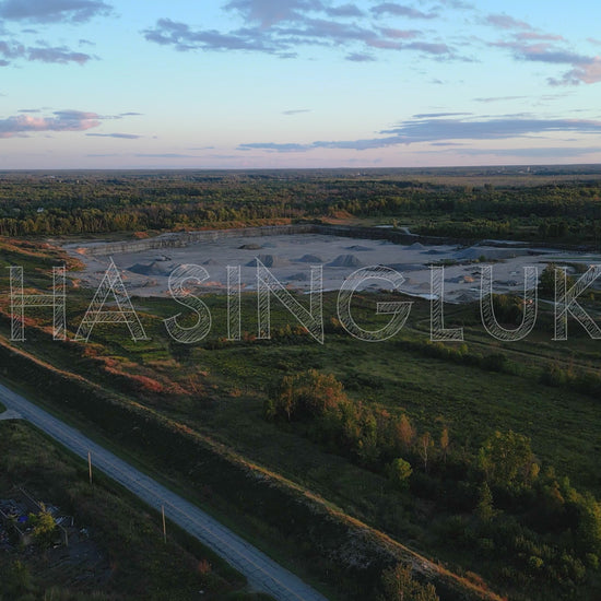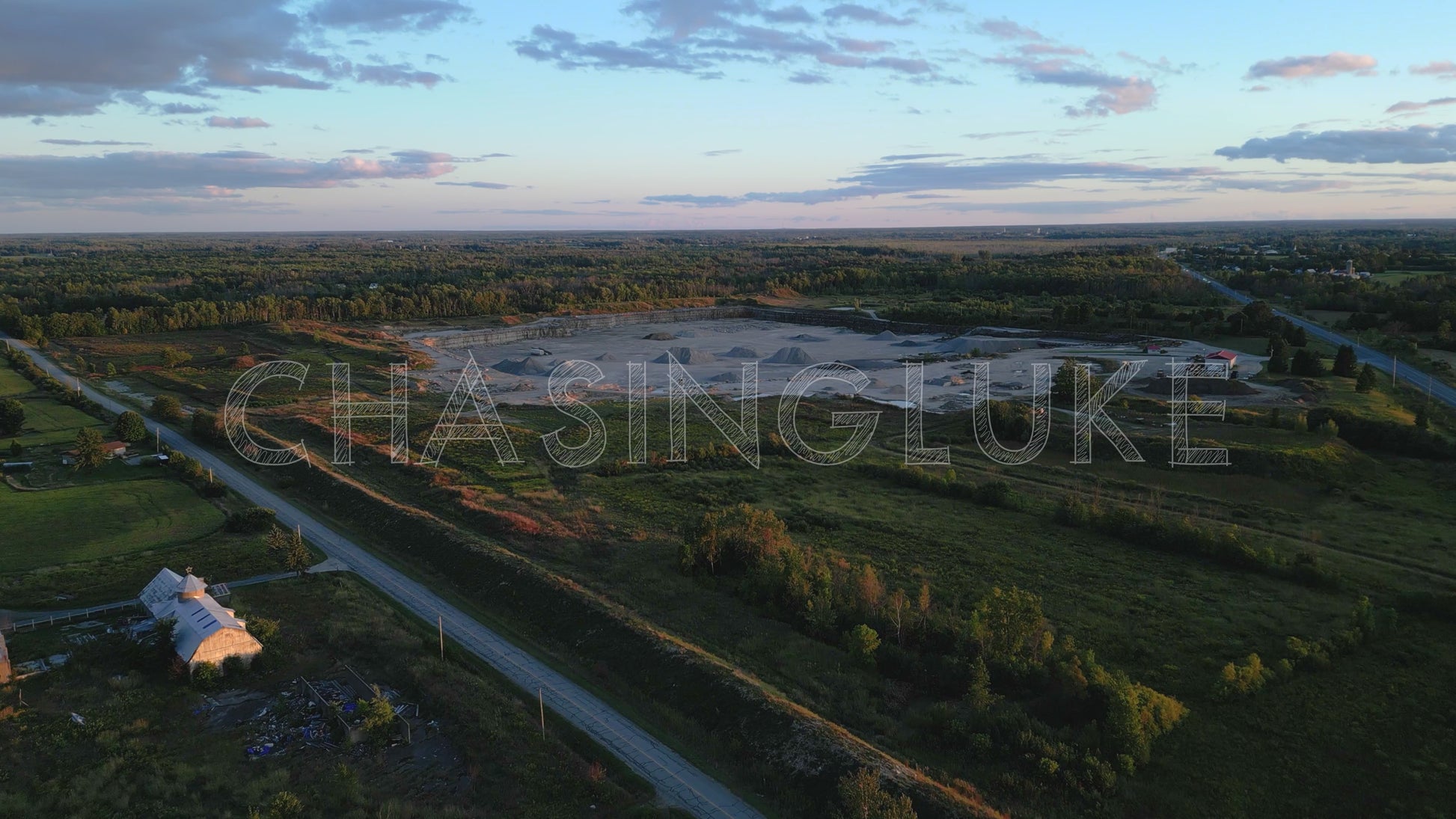 This 4K aerial clip captures a forward push across Leachs Road in Perth, Ontario, filmed in the warm tones of golden hour. The camera advances toward a sand & stone pit, while contrasting forests spread out in the distance.