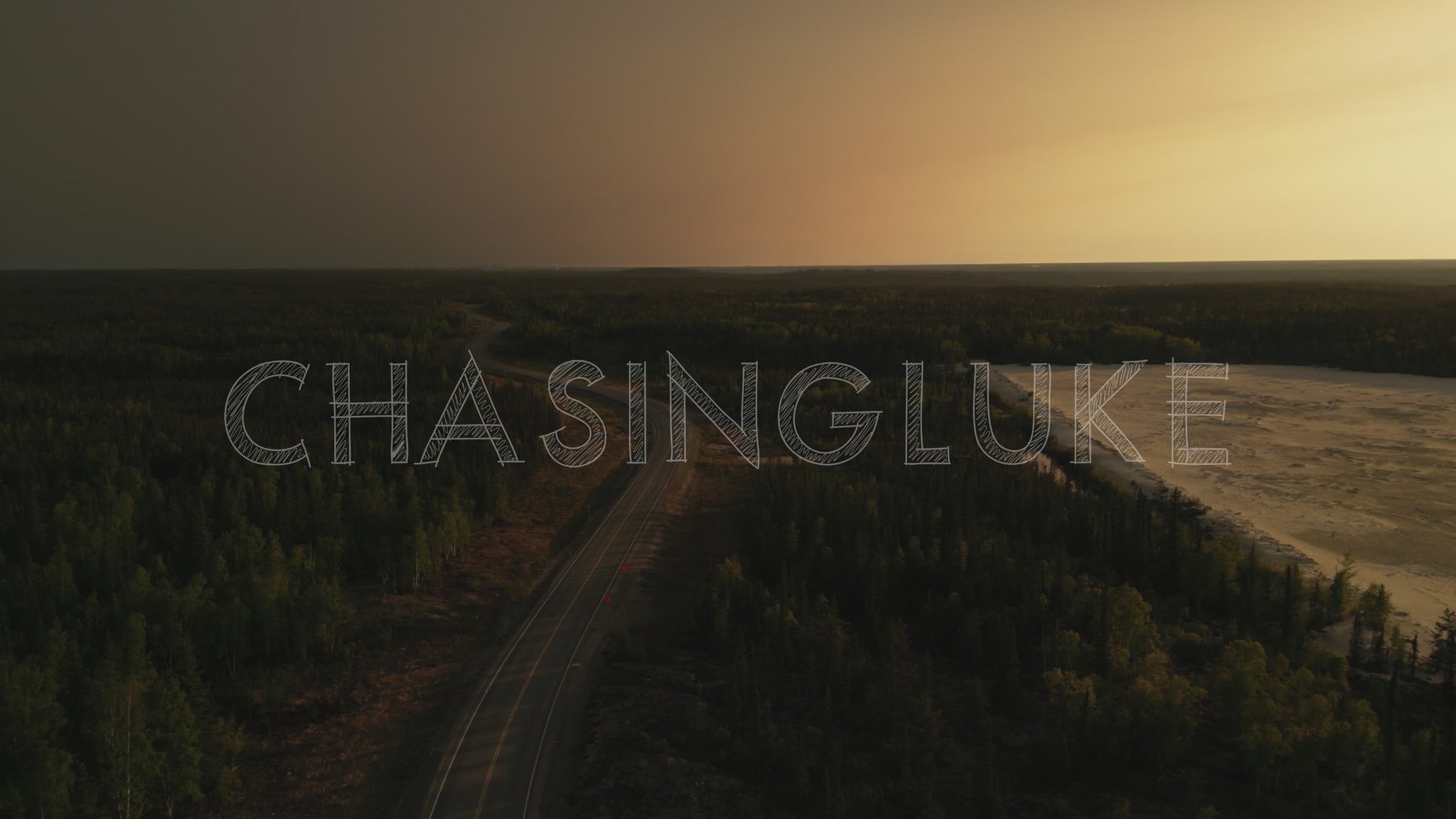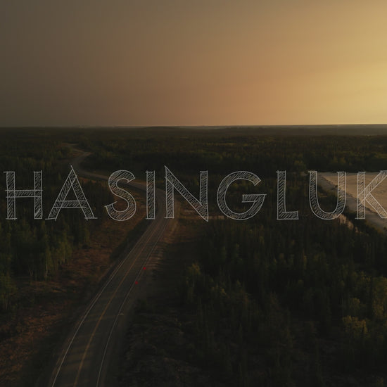 A high contrast reverse drone shot captures the Ingraham Trail as it winds past Ptarmigan Mine near Yellowknife, Northwest Territories. The camera pulls smoothly backward high above the road, with the mine’s tailings off to the right. The road disappearing behind trees. In the distance, the Yellowknife skyline appears very small and faint through wildfire smoke, adding a sense of depth and isolation.