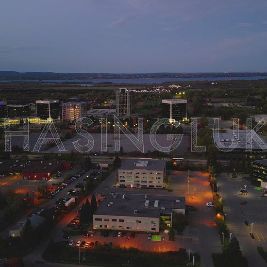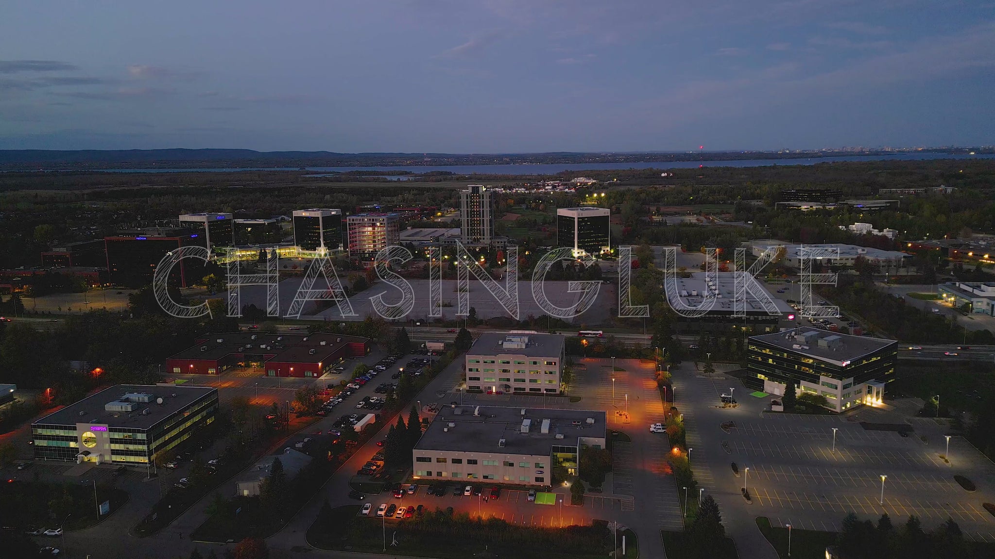 Flying at a steady medium altitude in full evening darkness, this drone clip glides backward alongside Innovation Drive in Kanata North's Tech Park. Streetlights line the roads, casting pools of light across parking lots and surrounding office buildings, many of which remain lit after hours. Below, headlights from moving traffic on Hines Road and March Road bring dynamic motion to the lower frame, while the rest of the tech park glows quietly under the night sky. This cinematic clip offers a polished urban-night aesthetic. Perfect for themes of infrastructure, late work culture, or nighttime cityscapes.