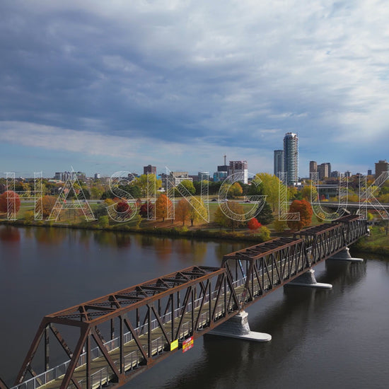 This cinematic drone clip opens above the Chief William Commanda Pedestrian Bridge, then gradually pulls back to reveal a layered Ottawa landscape in autumn. The steel truss bridge stretches across the Ottawa River in the foreground, while an active Kichi Zibi Mikan Parkway (formerly the Sir John A. Macdonald Parkway) lies behind a burst of colourful foliage lining the shore. Beyond the midground, the Bayview area and Centretown West rise into view, adding an urban counterpoint to the natural riverfront. This pullback motion creates a smooth transition perfect for establishing shots or visual storytelling around Ottawa’s blend of infrastructure, nature, and community.