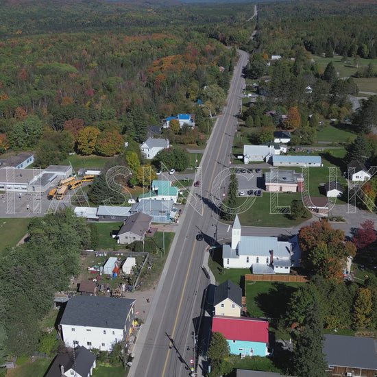 This sweeping quarter-orbit begins with a east facing view straight down Highway 62 in Maynooth, Ontario. The drone rotates looking counter-clockwise in a gentle arc, revealing the public school where buses are lined up for afternoon pickup. As the camera shifts north, the view opens to a broader landscape where Highway 127 stretches into the distance and fades into a vast, forested horizon. A mix of orange-toned autumn trees colors the background hills, creating a transition from small-town energy to natural expanse. This shot is ideal for conveying movement, seasonal change, or the relationship between rural life and the surrounding wilderness.
