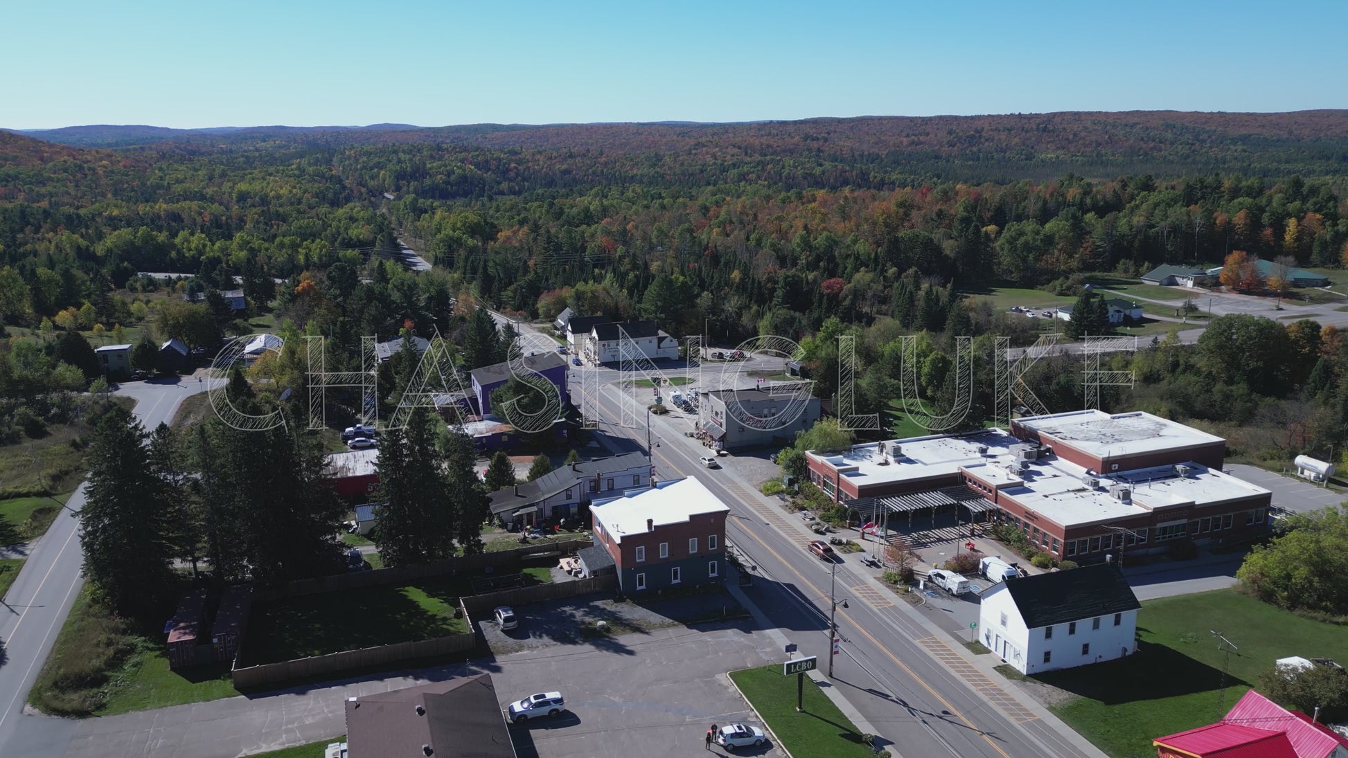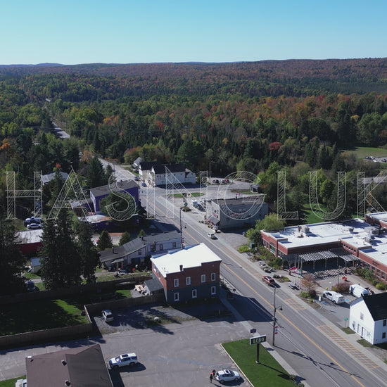 This west-facing drone shot begins near Maynooth’s public library and general store next to the junction of Highway 127. Flying in reverse, the drone steadily pulls back to reveal key town landmarks including the church and public school. Young Street appears on the left side of the frame, adding to the small-town layout. In the distance, soft orange hues from early autumn trees colour the hills, offering a sense of seasonal transition. Filmed under clear skies with late afternoon light, this clip is perfect for showcasing community structure, rural heritage, or fall ambiance in Hastings Highlands.