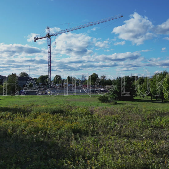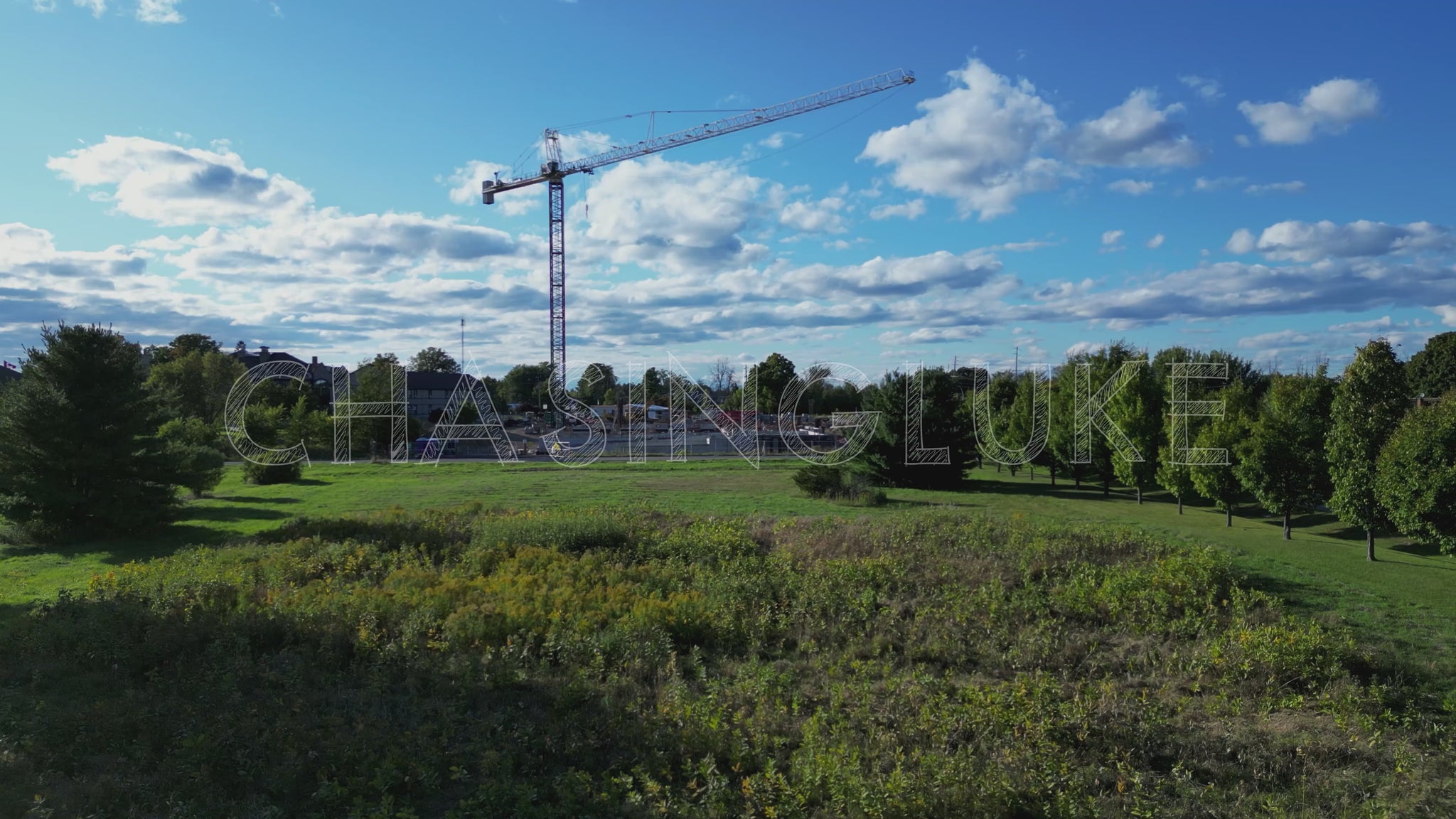 This 4K aerial clip begins with a focus on a towering crane at a construction site off Sunset Boulevard in Perth, Ontario. As the drone rises, the frame expands to reveal more of the construction zone, including equipment, materials, and developing structures.