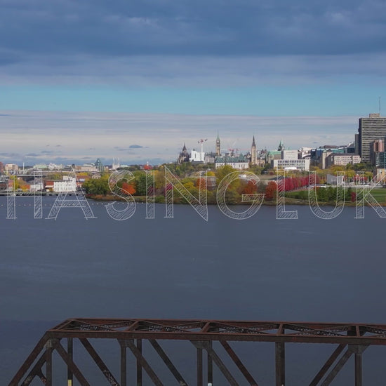 This drone shot opens in front of the Chief William Commanda Bridge, slowly zooming out to reveal downtown Ottawa’s skyline framed by Nepean Bay. Centered in the distance, the Parliament buildings rise prominently, anchoring the composition. Along the shoreline, vibrant red trees stand out in the parks near the Canadian War Museum, hidden behind the riverbend. In the water below, the safety buoy line leading to Chaudière Falls adds subtle detail and a sense of place. Ideal for cinematic transitions, institutional storytelling, or autumn-themed visuals of Canada’s capital, this shot captures the city's harmony between natural beauty, civic architecture, and historical geography.