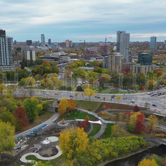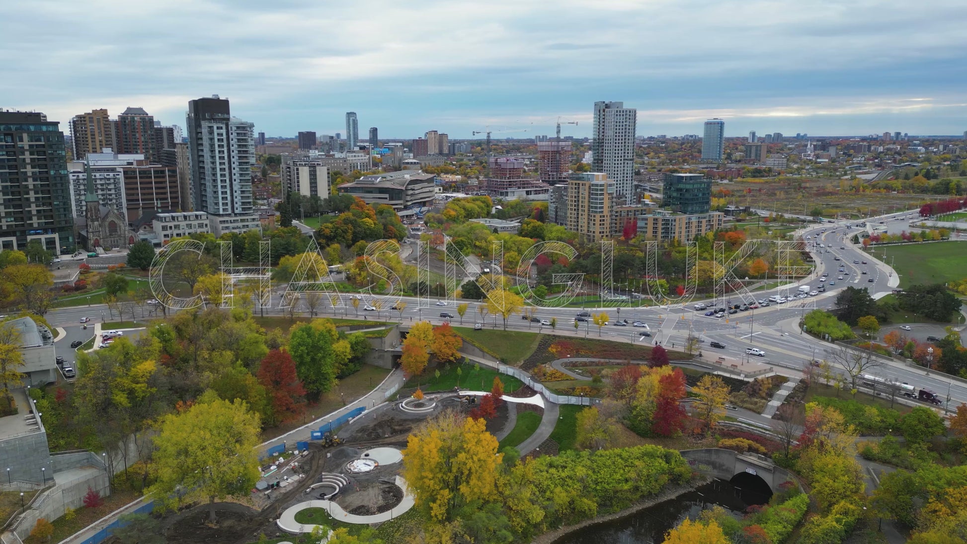This high-altitude aerial shot offers a static view of Ottawa’s Portage Bridge and Wellington Street intersection during peak fall colour. The still camera captures a clear, layered composition, lime green, yellow, and orange foliage line the surrounding parks, while the Trans Canada Trail run through the scene. Below, steady traffic moves along the roads, providing subtle activity in an otherwise composed and balanced frame. Ideal as an establishing shot, this footage offers a bird's-eye perspective of Ottawa’s capital, urban landscape, civic infrastructure, and autumn transitions.
