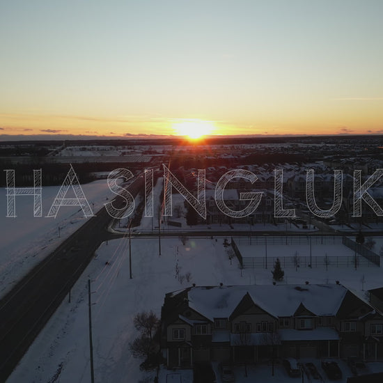 This vertical drone ascent offers a view of Hope Side Road on the southern edge of Kanata. Snow blankets the open fields to the left and stretches into the distance, contrasting sharply with the dense, orderly suburban homes packed along the right side of the frame.